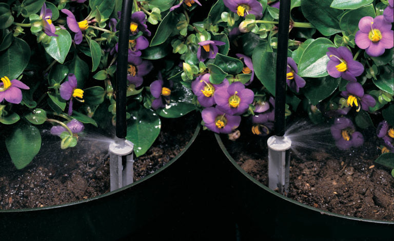 When there are large spaces between containers, overhead irrigation is inefficient because water that goes between containers doesn’t reach the plants. In some nursery layouts, more water can fall between containers than into them. This is where spray stakes improve irrigation efficiency. Spray stakes are placed directly in the container and fed by 1/8” poly tubing. They wet the entire soil surface within the container without overspray between containers. Spray stakes (sometimes referred to as “nursery drip”) are usually used in larger containers, ranging from 5 gallons to 48” boxes or even larger. However, the decision between overhead and spray stakes also depends on the type of plant, climate and cost of water.